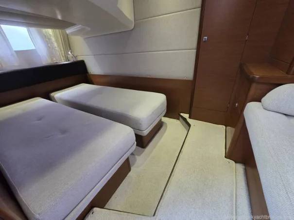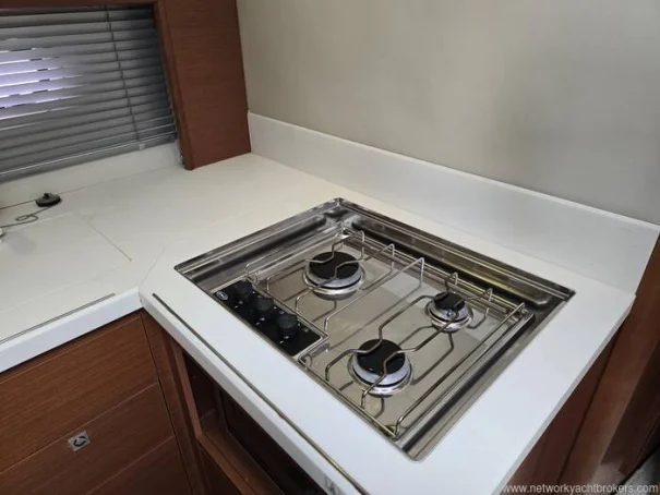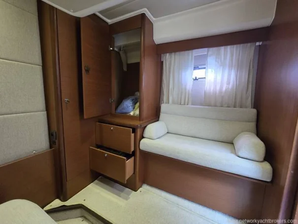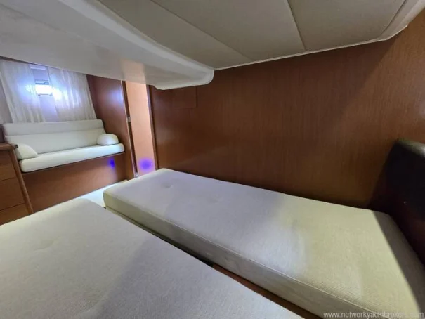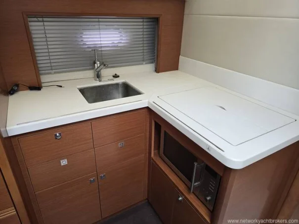 Sous le pont, l’intérieur est lumineux, spacieux et intelligemment conçu pour la vie à bord, avec des assises confortables et une cuisine bien intégrée à bâbord. Deux cabines bien proportionnées offrent un excellent confort pour le propriétaire et ses invités, complétées par une salle d’eau avec WC et douche.
