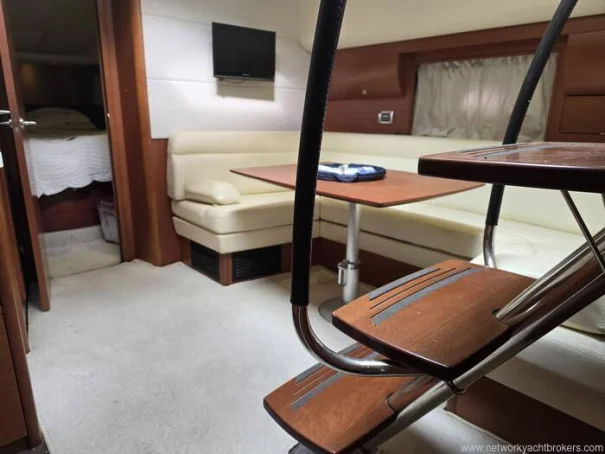 Below deck, the interior is bright, generous, and thoughtfully designed for social living, with comfortable seating and a well-integrated galley to port. Two well-proportioned cabins, offer excellent accommodation for owners and guests, along with a practical WC/shower compartment.