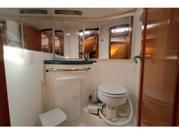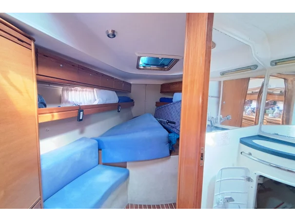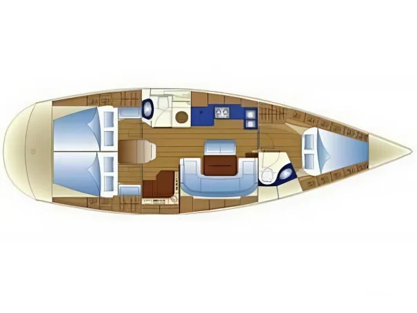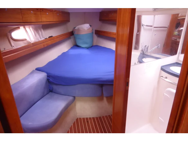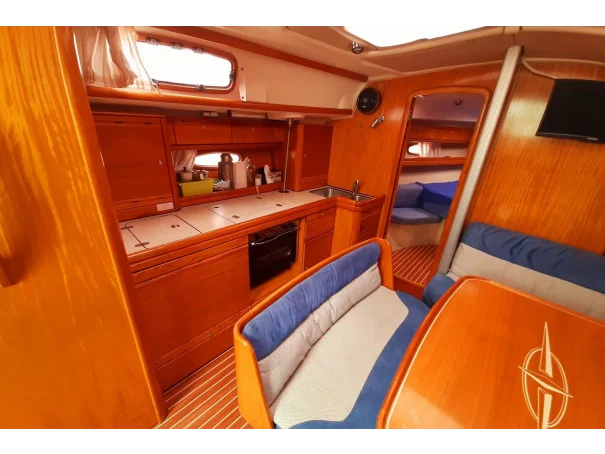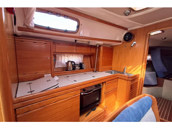 A practical three-cabin layout with two aft cabins and a forward owner’s cabin. The saloon is centrally positioned with good seating and natural light, while the galley and navigation area are conveniently located for use underway or at anchor.