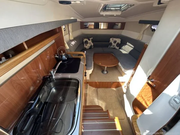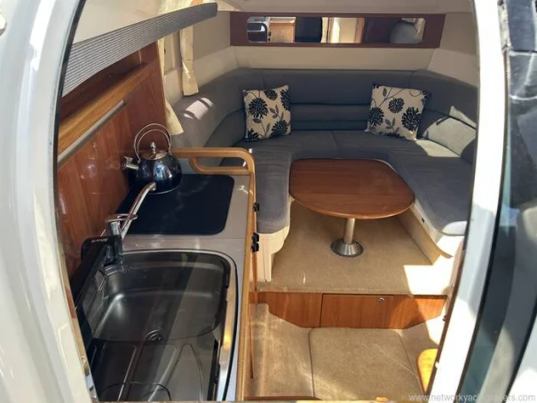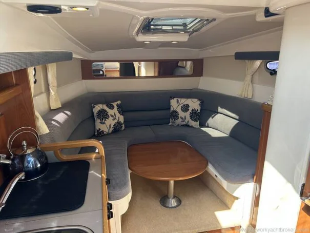 She has a raised helm position with double helm seat which offers good all-round visibility and easy access to engine and navigation instrumentation. Behind the helm is a seating area with removable table. This will convert to a small double berth or sun pad area with the table in the lowered position using the infill pads provide.