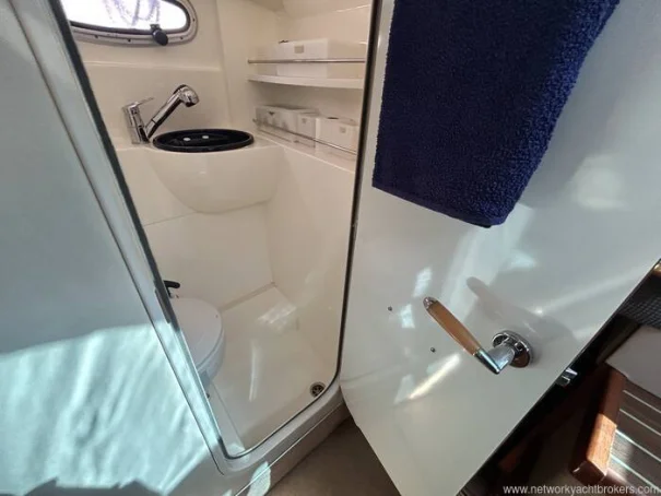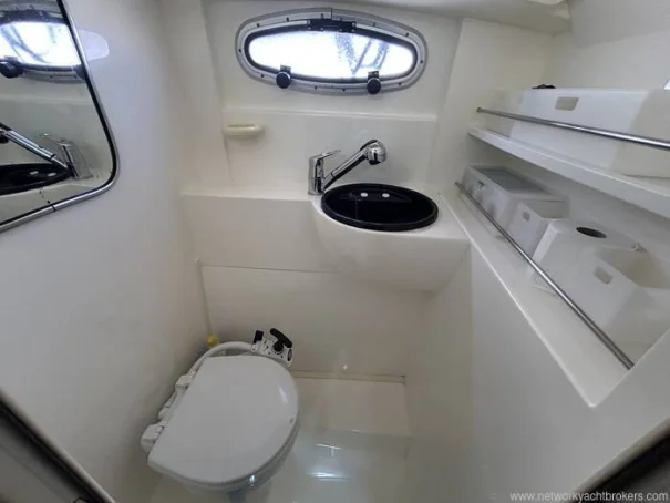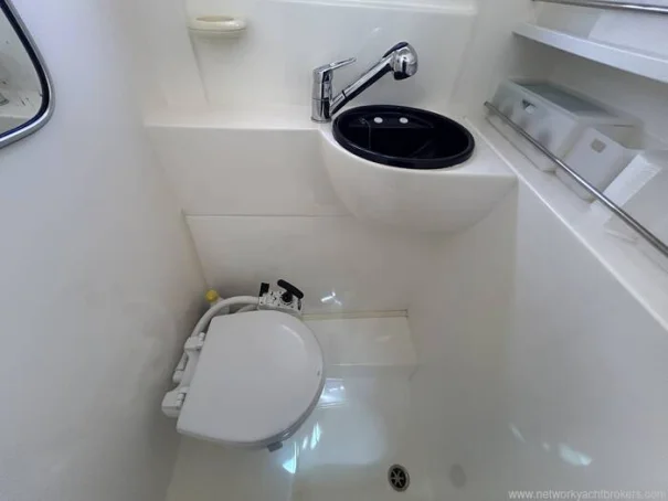The heads includes a shower with pump out, wash basin and a manual Jabsco toilet with holding tank.