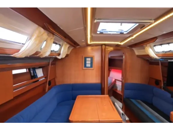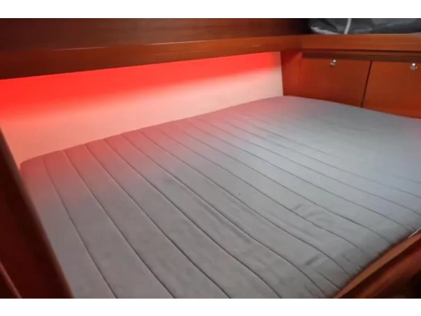 2-cabin version with a heads and separate shower. The forward berth has been enlarged to 220 x 150cm with a custom mattress - noticeably wider than the original factory fit. A dedicated heated foul-weather locker keeps wet gear separate from the living space. The aft storage locker is cavernous. Saloon converts to an additional berth.