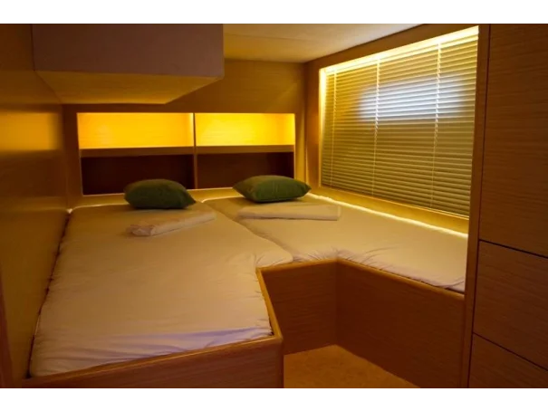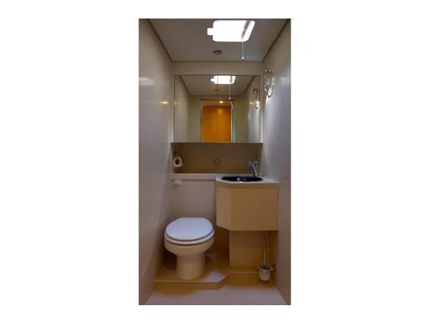 Below decks, the master cabin sits forward with a spacious double berth and its own ensuite bathroom. A second double guest cabin and a separate dayhead with shower ensure genuine privacy for owner and guests. Headroom throughout is notable for a boat of this length - a product of her custom construction rather than cost-cutting compromises.