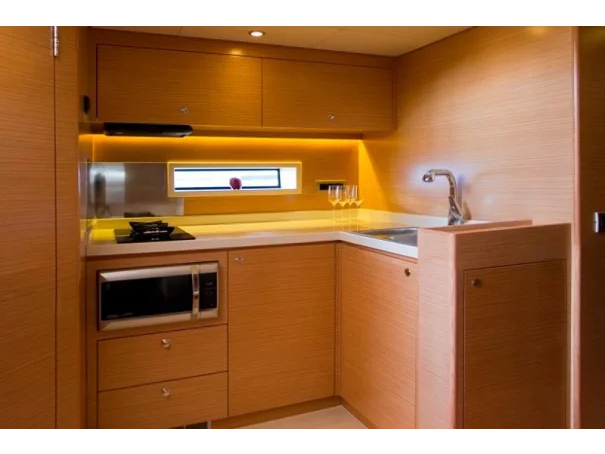 At just under 14 metres with a 4.45m beam, she carries her volume well. Three cabins, two heads, and a saloon that opens naturally to the cockpit give her a social, airy feel - the kind of boat you live on, not just sleep on.