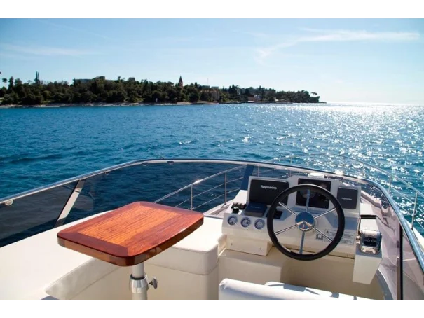The flybridge is the defining feature - a full helm console above, with a sunbed aft and clear 360° visibility underway. Below, the cockpit centres around a large dining table that converts to a double berth, making it as useful at anchor as it is at the dock. Teak detailing, stainless cable railings on the sidedecks, and a bathing ladder and deck shower off the swim platform complete the picture.