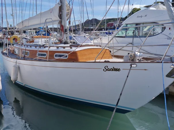 "Saoirse" is a classic yacht of quality timber construction built by the craftsmen in Robertsons of Woodenbridge, Suffolk. The brief was for a classic cruising yacht capable of fast passages with single handed sailing if required, to perform well over a wide range of wind strengths with an easy motion but, above all, with an integrity of structure which assures safety. The finished yacht easily fulfilled her brief by achieving 6th overall monohull in the 1993 Round Britain Race under her original name "La Gamine" Subsequently sold to the West of Ireland when she was re-named. Later sold to Dublin when a replacement Yanmar diesel installed. Current owner purchased as a "Covid" project and brought to an exacting standard by an experienced yachtsman refurbishments to include replacement standing rig and other enhancements listed in the specification with the year against the various additions. Placed on the Irish Ships Register by the current owner. A quality built yacht that will not disappoint on viewing by arrangement. Accommodation : The voluminous saloon has a U shaped berth to port with telescopic support table to form a double berth. Lockers outboard and above seat backs. To starboard, bench seat extends to form a berth. Pilot berth above on starboard side. Lighting via deckhead lights. Saloon separated from galley and navigation station by half bulkheads and supports. Chart table to port with chart storage and with book shelf, circuit breaker panel and stowage outboard. Batteries stowed under navigators seat. Lighting via deckhead LED lights and adjustable chart lamp. Quarter berth aft of navigation station. Galley with stainless steel gimbal cooker with oven and grill. Domestic water pump replaced 2023 Stainless steel double sinks, cool box, cutlery drawer, Stowage for plates and mugs. Cooker protected by crash bar. Inboard under the bridge deck there is a wet gear locker. Companionway steps mounted over a tool storage compartment. Steps, tool box and panel may be removed to expose engine for easy access. Grab rails fitted to either side of companionway. Teak was boards which may be locked from inside our outside. Forward of main bulkhead the heads are situated to port side. Jabsco heads pump 2021 Wash basin to starboard opposite heads. The heads area is spacious with grating and timber doors to saloon and fore cabin. Forward cabin with two berths and infill piece. Stowage under berths. Forward in the fore cabin is a sail storage locker. Interior of hull lined with battens forward. Autotherm 4kw diesel heater installed 2023